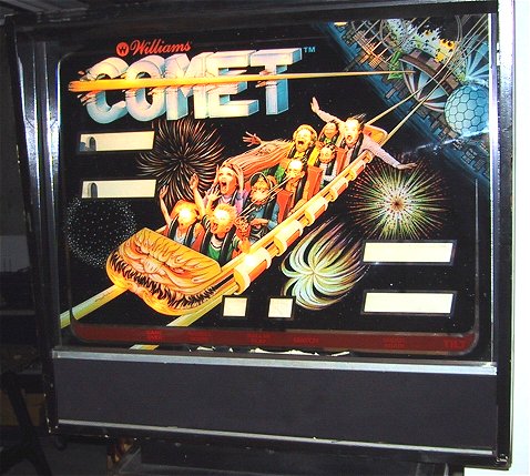 Facts: Comet was released by Williams in June of 1985. It was designed by Barry Oursler with art work by Python Anghelo. Comet was one of the three System 9 games released by Williams (Space Shuttle and Sorcerer being the other two). Comet was also the first of the "trio" of amusement park roller coaster games to be released by Williams. Cyclone (1988) and Hurricane (1991) complete the trio. The backglass to the right is the one in my game. You may be noticing that its missing the displays... Read on regarding my $85 purchase... |