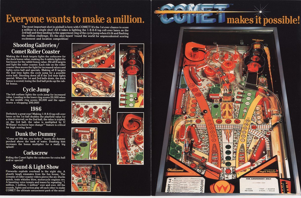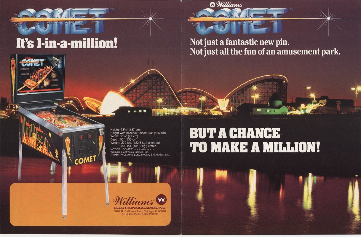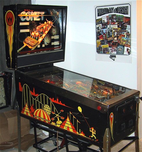 Comet Story (or what you get for $85 at an auction...): Comet had been on my "wish" list for over a year. It wasn't a game that I was going to actively try to find, but if one found me I would consider buying it. In December of 2001 I attended the Pennsauken, NJ auction on the lookout for a good deal. I had my eye on a pair of Pinbots (Williams, 1986), a Black Knight 2000 (Williams, 1989) and a Laser Cue (Williams, 1984). All four games played well, with one of the Pinbots having the numeric displays out and the Laser Cue had some funky bell ringing going on. The auction was interesting, the crowd was mostly "Christmas" buyers, and the prices all ranged from $500 to $1,500. There were some great deals (CV for $1,800) and some screwy ones. Mainly the games I was interested in! The Laser Cue went for $480! (I bid up to $350). Then both of the Pinbots went for around $800... I heard through the auction grapevine that the BK2K would be a buyback up to $900, and sure enough, I watched the owner bid it up to $900. Then they came to this Comet. I had seen it earlier, but it had no displays and no playfield glass or lockdown bar. Nobody even bothered turning it on. Well, they powered the thing up for the auction and it actually booted and played a game. It started at $50, and I put a bid in during the initial frenzy, and before I knew it the auction was over and I had bought a Comet for $85! If there is truly a