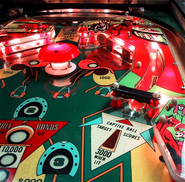 Game Facts: The Mr. Pinball Guide states that 4,903 Hot Tips were produced in solid state format and 1,300 were produced in EM format. Hot Tip was designed by Tony Kramer (Algar, Disco Fever, Tri-Zone and Pharaoh) with art work by Christian Marche. One of my favorite features of the game is the fact that it still uses EM style chimes rather than electronic sound. It still dings and dongs when you score, plus just to make sure you know you're scoring, there is even an old EM score reel in the cabinet that is "clicked" every time you rack up some more points! Williams introduced electronic sound with World Cup two games later, but the sound is so poor by today's standards that the chimes and reels of Hot Tip are a symphony in comparison. Not until Flash and its continuous background sound did electronic sound finally surpass the chime unit.