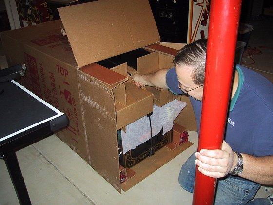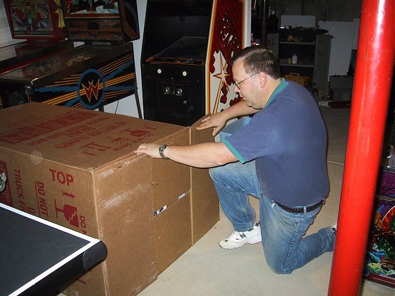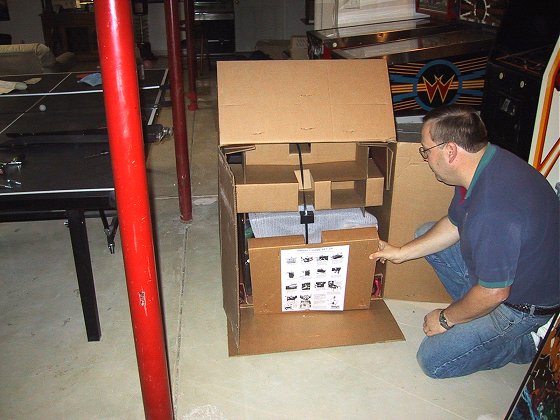 it downstairs! OK, so where are the pictures of the game going down the basement stairs? Well, we were too busy try to get the game down to take any photos, and I think my wife would rather not watch in case for some unknown reason the game got loose and came down by itself! I must admit however, that a game in a carton is much easier to get down the stairs than an unboxed machine. I pity those lost souls who are too anxious to look at their new machine that they take it out of the box on the driveway, then attempt to get it up or down some stairs!