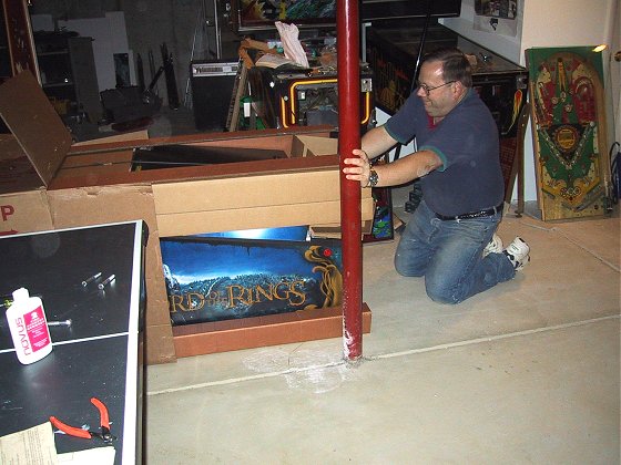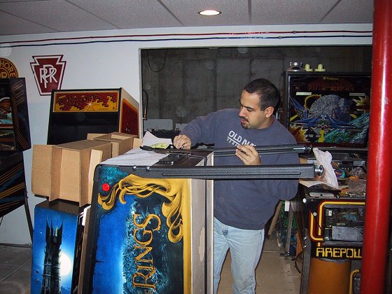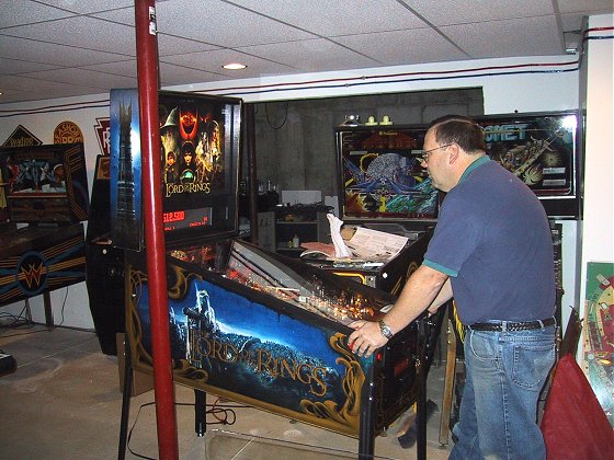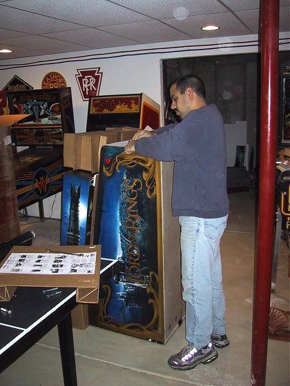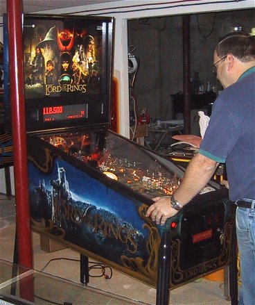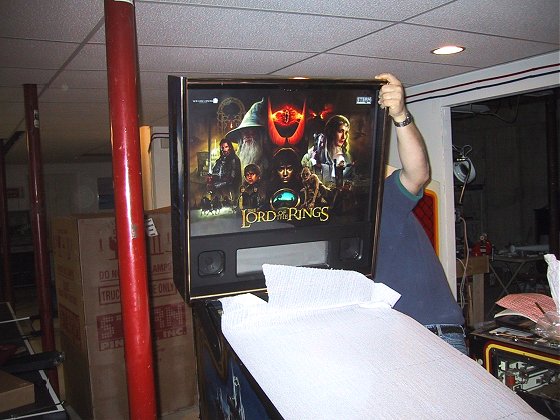 Once again, I've gone out on the preverbal limb and bought a NIB machine sight unseen. So far my record is 1-1, with Monopoly being a big win (I know I'm in the minority on this one, but I love it!), and RCT being a bust. When I sold RCT a few months back, I think it had less than 100 plays on it, and I took a bath on it. Why buy a NIB machine when you can wait and then pick up one cheap from suckers like me who buy them new? Its kind of like buying a new car versus a used car, the new game has that "new car smell", its clean, no wear on the playfield, no nicks, just a pristine playfield! LOTR had been rumored for over 2 years and has a theme that is just made for pinball, and with my older daughter being a big LOTR fan, I decided to go for it. The unexpected sale of my Dr. Who and Road Kings (an unsolicited sale on my part, somebody just showed up on my doorstep with cash in hand looking for pinball machines!) sealed the deal.
