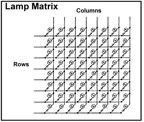 since January 2003: Disclaimer: Standard legal stuff, perform these tests and follow these repair procedures at your own risk. I cannot be held liable for any damage you may inflict on your boards or yourself. 1. Driver Board Architecture The Driver board is an extension of the MPU board. The best analogy to explain how the Driver board is connected would be to think of a personal computer with expansion boards. The slots on the PC motherboard carry all of the computers data, address and ancillary lines onto the expansion board. Other manufacturers of the era used a different architecture, and you could look at their driver boards more like the parallel or RS232 ports on a personal computer. Section 1 of the guide explains some of the reasoning behind this design. 1.1 Driver Board Interconnect The Driver board is mated to the MPU board via what is known as the "40 pin interconnection". There are actually 5 connectors of 8 pins each on each board that make up the interconnection. All of the CPU's address and data lines are carrier over this interconnection, making it the "Achilles Heel" of the design. Dirt and wear can make these connections unreliable and cause your game to lockup, reset or go wild at any point. Every time the Driver board is removed or attached to the MPU board, the solder connections are also flexed, and after time they can develop microscopic cracks that can also cause interruptions on the address and data lines. If you are experiencing intermittent problems with your game, then chances are you have a connector problem. Section 2 of the guide deals with these types of problems and make sure you review it and follow the tips presented there first. 1.1.1 Repairing the Driver Board Interconnect Should you replace all of the connectors in the Interconnection? A good visual inspection of the pins on the Driver board should be done first to make sure none of the contacts have broken. If one or more of the connectors look discolored, this may be the result of a driver transistor "frying" and these connectors should be replaced. You must however, always re-solder the pin connectors or both the MPU and Driver boards. Heat the joints with your soldering iron until the solder melts and flows around the joint. Attempting to diagnose problems without first doing this is a waste of your time. 1.2. Driver Board Functions There are six different circuit types contained on the Driver board: 1. The Solenoid Drives The board also contains 3 PIAs (Peripheral Interface Adapter), Motorola 6821 chips. These interface the various circuits to the CPUs address and data lines. 1.2.1 Solenoid Drives Williams labels the solenoid circuits in its schematics as "solenoid drives", however these circuits actually ground the solenoids. Positive DC is always supplied to the solenoids and they are isolated from ground via the Driver board. This design has proven less complicated (fewer parts = lower cost) and more reliable than "driving" the solenoids with positive DC. Games through System 11 have two types of solenoids, regular (or just "solenoids") and "special" solenoids. Section 1.2.2 describes the difference between the two. Williams games have 16 solenoid lines and 6 special solenoid lines, giving the game the capacity to fire up to 22 coils independently. System 3 through 6 games utilize 5 solenoid lines for sound and speech. Williams added an additional PIA to System 7 boards to control sound and speech, leaving 21 solenoid lines available for game coils (in System 7 games, 1 solenoid line is used for GI lighting effects). Solenoid lines 1 through 16 are triggered solely via the game's program. 1.2.2 Special Solenoid Drives All Williams games in the System 3 through 7 era use a set of what are known as "special solenoids". These are solenoids that can be fired either under game control or directly by a playfield switch. The game's program does not run fast enough to detect and fire the coils for the pop bumpers or the kickers. There would be enough of a lag time from the time the ball runs over a pop bumper skirt switch to the time the game fired the bumper's coil that the game would seem extremely "slow". In order to compensate for this, Williams incorporates six "special" solenoid lines which can be triggered directly from a playfield switch. This circuit bypasses the MPU altogether and fires the coil in real time. For testing and diagnostic purposes, the coil can also be fired by the MPU, and an additional logic IC in the circuit allows the coil to be triggered by both the MPU and playfield switch. You'll notice that there are two sets of switch contacts on a pop bumper and an additional switch connected to the throw arm on slingshot kickers. These are the "scoring" switches, which are activated when the pop bumper for kicker fires. These are required since the trigger switch is not connected to the MPU. There were two exceptions to this rule, Time Warp and Stellar Wars each feature 5 pop bumpers. In Stellar Wars, the lower right pop bumper was driven by the MPU and in Time Warp the designers moved the kickers to the MPU controlled solenoid line. 1.2.3 Lamp Column and Row Drives Your game has the capability of driving up to 64 different lamp positions (with up to 3 bulbs at a position). The lamps are wired in a "matrix" of 8 columns and 8 rows that only requires 16 wires to light 64 different lamp positions. Each lamp is wired to one of 8 "columns" and one of 8 "rows". The MPU then turns "on" a column and a row, lighting the lamp at the intersection. The game actually rotates through the columns one at a time, turning on the required rows for that column. Diodes wired in series with the lamps prevent voltage from "leaking" out and turn on other lamps. 1.2.4 Switch Matrix Like the lamp matrix, the game has a switch matrix of 8 columns and rows that allows up to 64 individual switches to be read. Switches are wired like the lamps in the above diagram, with a switch in place of a lamp. The game w