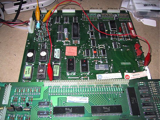 System 6 board: You're now ready to test the PIAs on the driver board with either your Logic Probe or the test LED. To use the test LED, connect the negative end to ground and then touch the positive end to each output on the PIA (pins 2 through 17). I prefer to use a Logic Probe for this since it has a smaller tip. Note, testing the third PIA on the driver board (IC11, the vertical one), you will need to short the pins on connector 2J3 to ground in order to test outputs PA0 to PA7 (pins 2 through 9). Driver Board setup for bench testing lf the PIAs are working, you can move onto the driver tests. I prefer to use the test LED to perform the majority of the remaining tests: Switch Matrix Driver Test - Connector 2J2 Connect the positive side of the Test LED to +5v. Then touch the negative lead to each pin on 2J2. You should see the LED pulse in time with the MPU board LEDs. If you don't get a light pulse on one of the pins, then trace the signal back through either IC17 or IC18. If the PIA has a good signal, but none shows up at the pin, then you need to replace either IC17 or IC18. Switch Matrix Input Test - Connector 2J3 (updated 7/22/03) You need to test the switch inputs at the PIA itself. The inputs are on PIA II (IC11), pins 2 through 9. To test input #1, ground pin 9 of 2J3 and then using your test LED or Logic Probe, look for a pulse at pin 2 of IC10. Then move the ground to pin 8 of 2J3 and check for a pulse at pin 3 on IC10. Continue moving the ground down a pin and checking the next PIA pin (PIA pin 4 to connector pin 7, etc). Lamp Strobe Test - Connector 2J5 This test requires an additional power connection (see below). Connect +5v to any pin on connector 2J4. Remove the positive connection of the Test LED from the +5v connection. Then connect the negative side of the Test LED connected to ground. Perform the test by touch the POSITIVE side of the Test LED to each pin on connector 2J5. If you don't get a flash, check the input to the IC controlling the pin (IC13 or IC14). If you have an input then you'll need to replace either the TIP42 or the pre-driver 2N6472. The test LED won't show the output of the IC due to the short signal pulse.