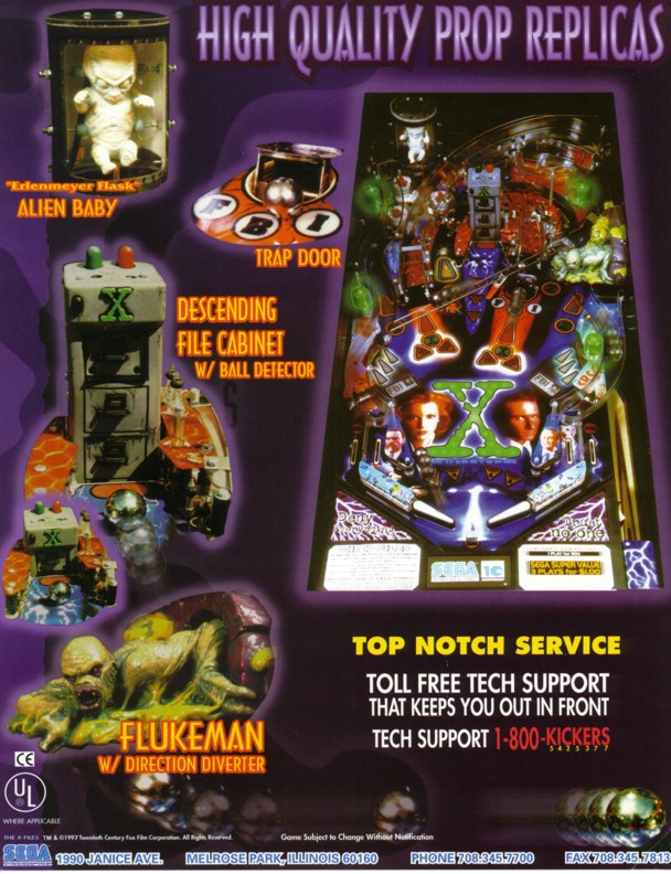 X-Files was produced by Sega Pinball in 1997. A total of 1,500 games were produced. The game is based on the Fox TV Series. You need to be an "X-phile" to know why the match feature uses bees. X-Files featured a "curved" back box, a design innovation that thankfully didn't catch on. This necessitated a "stand" on the top of the back box that needed to be lowered when moving the machine, otherwise the translite would be crushed. Little known fact: while there are two speaker grills in the back box, there is actually only one speaker installed. X-Files Resources from Mark's Pinball Pages: X-Files